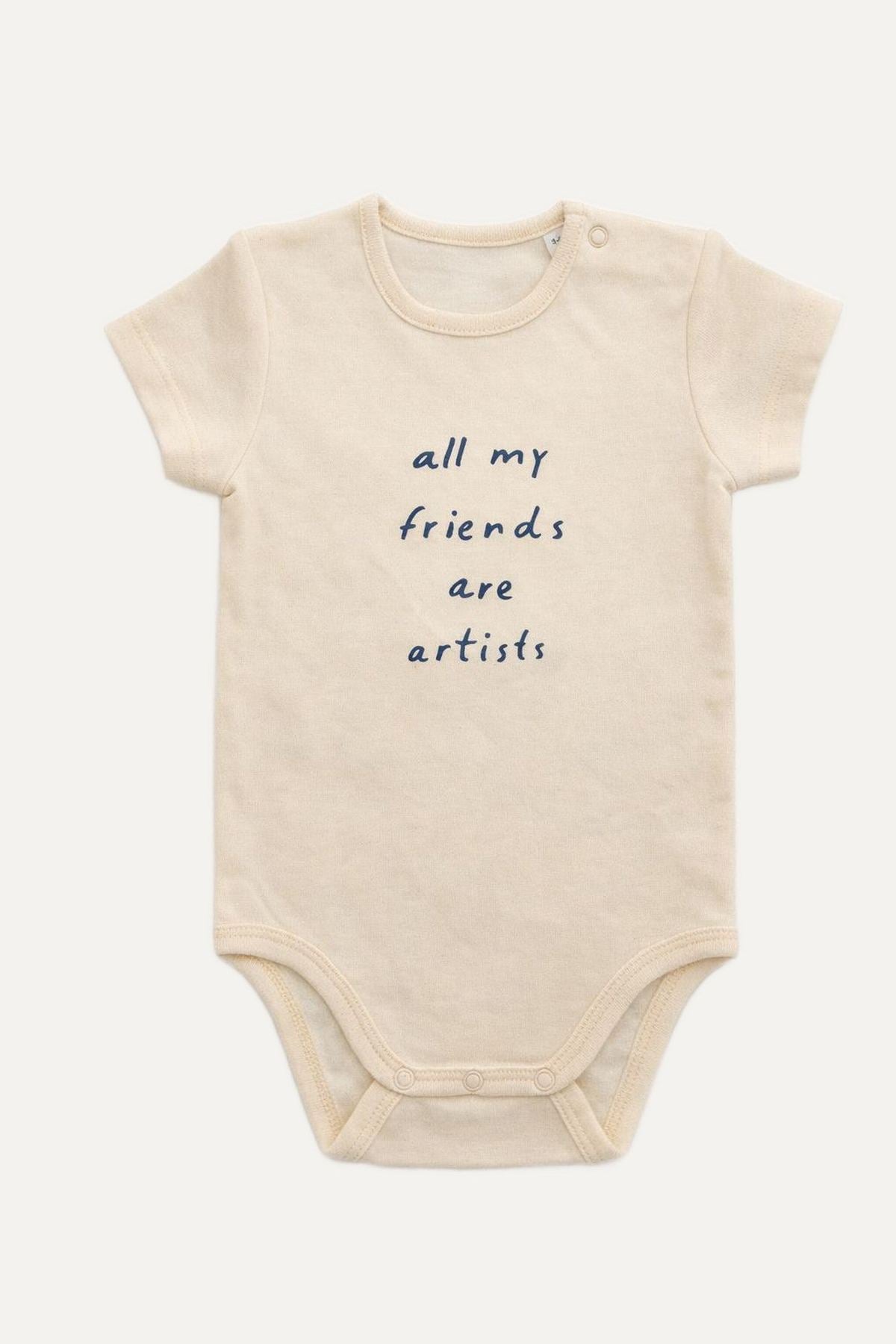 The "All my friends are artists" romper is a comfortable and distinctive offwhite garment designed for babies and kids.