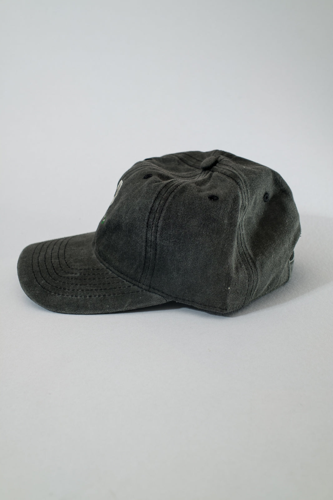 The millennial holiday dad hat is a low-profile, unstructured baseball cap featuring a faded black finish. It is designed for casual, comfortable wear.