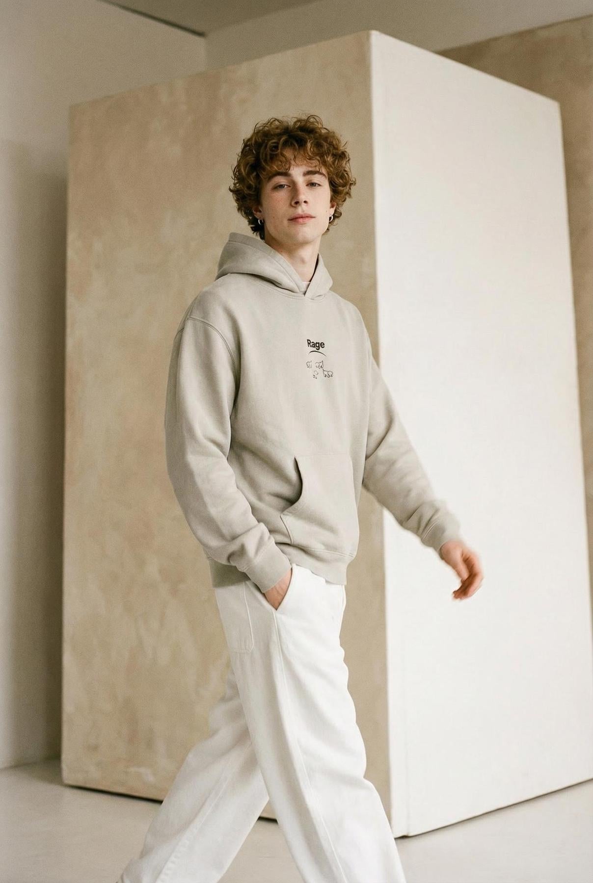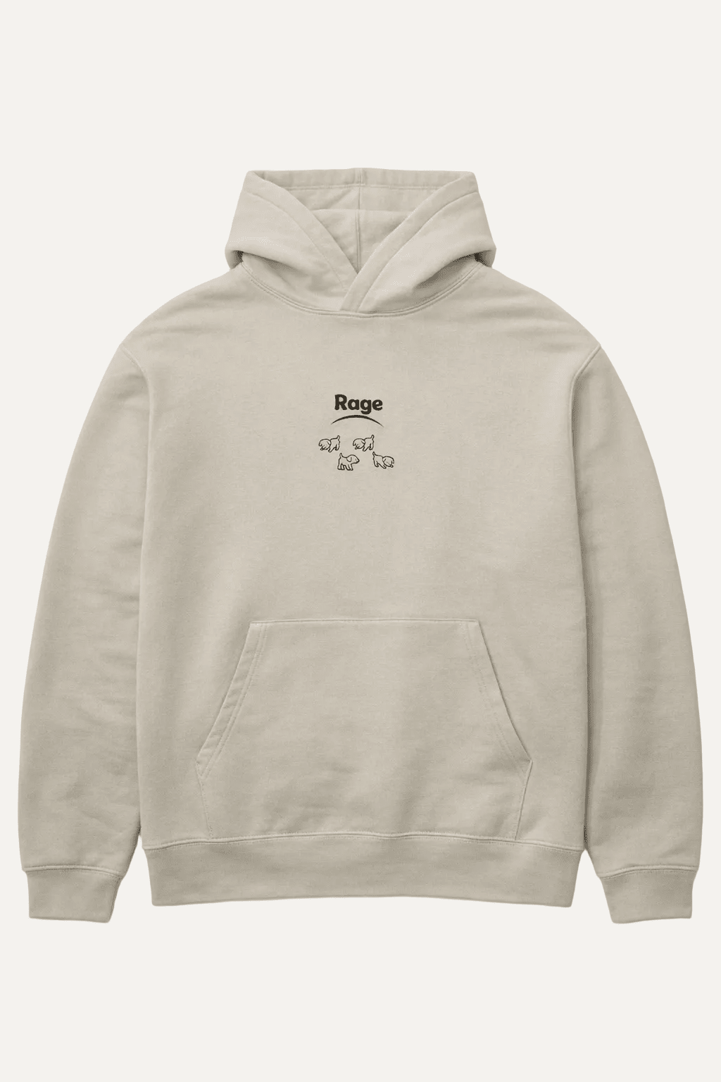 The Stone grey hoodie Rage organic cotton is a comfortable, unisex garment made from organic cotton. This piece features a stone grey color with the "Rage" graphic.