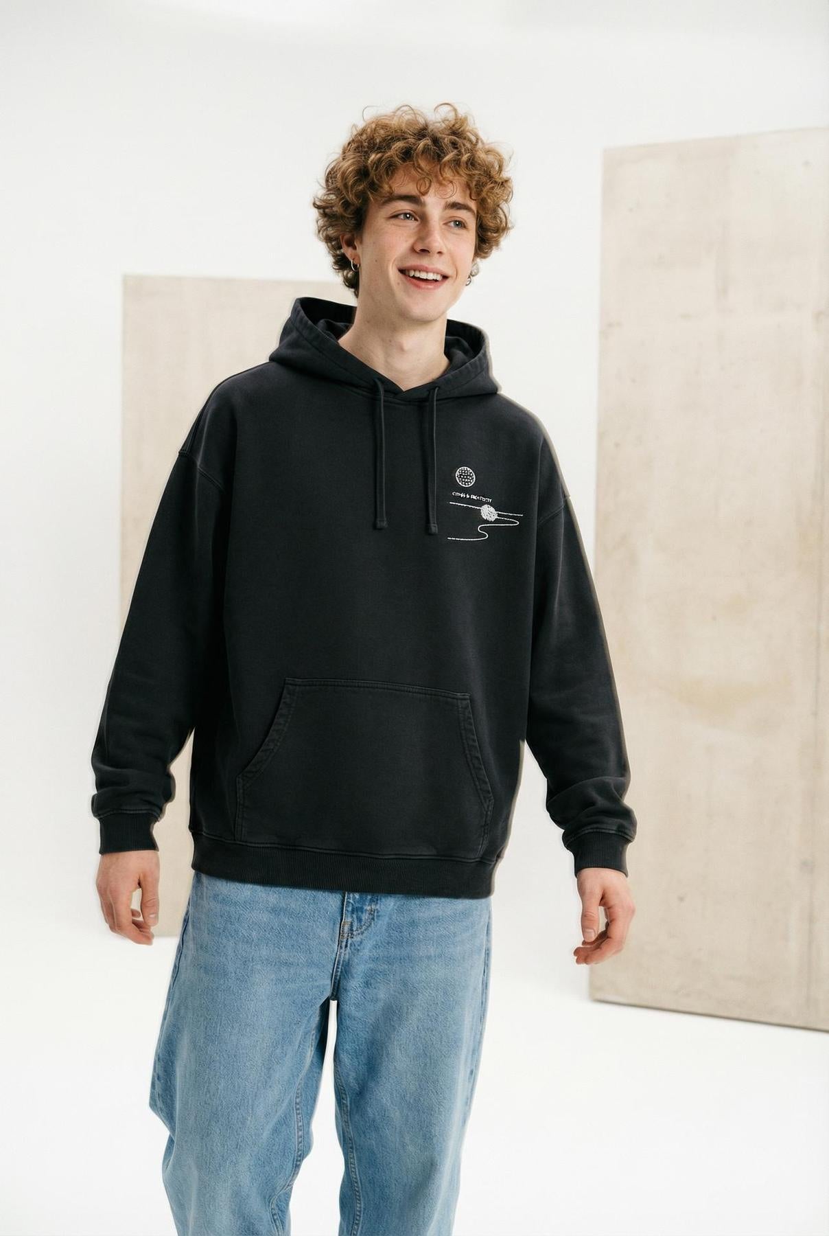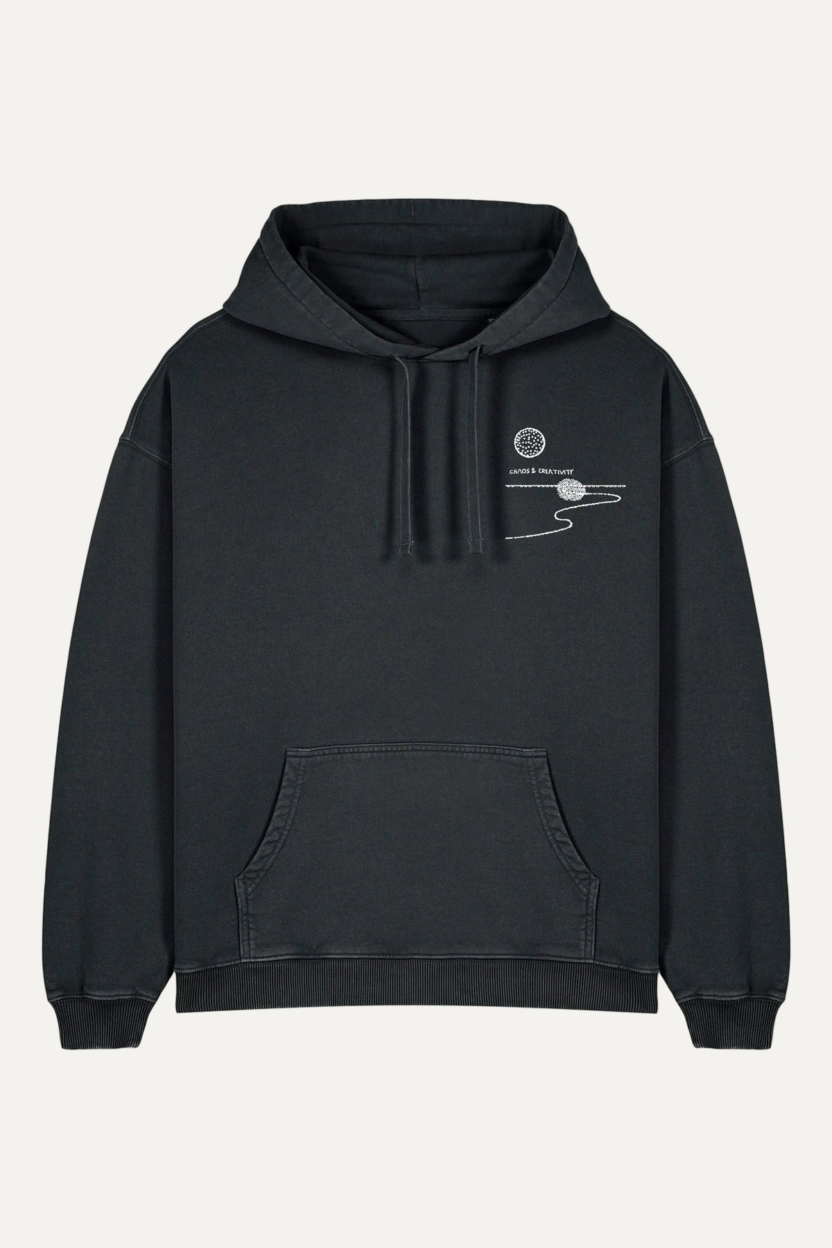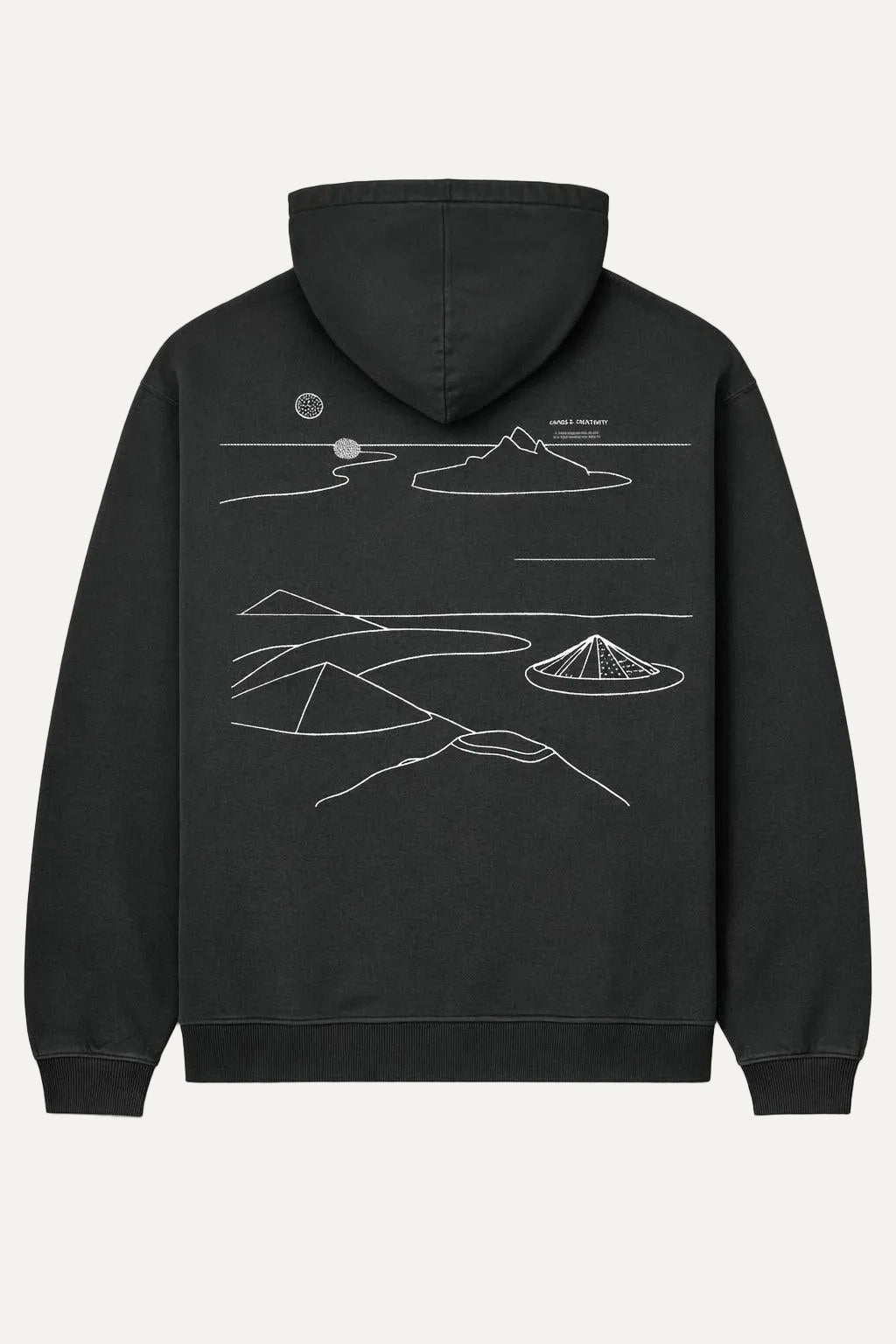 The washed black organic hoodie is a comfortable, unisex garment featuring the 'island lines chaos and creativity' graphic.